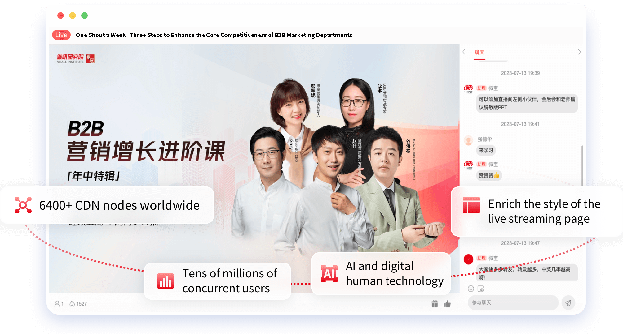 Engage your audience with multi‑guest live streaming, virtual gifting, red envelopes, prize draws, polls, Q&A, private messaging, and more.