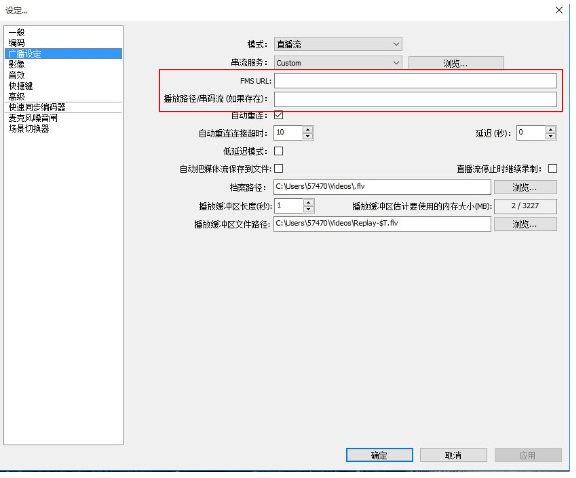 将RTMP URL复制到FMS URL中,将串流码复制进入串流码中
