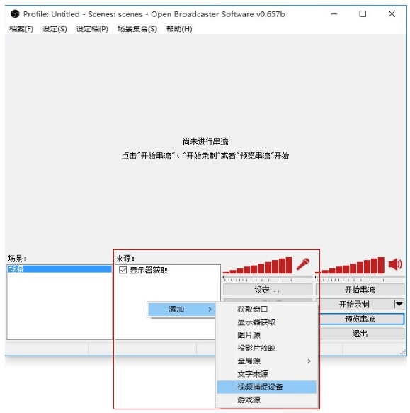 如果需要使用视频设备,请右键单击来源,选择添加视频捕捉设备