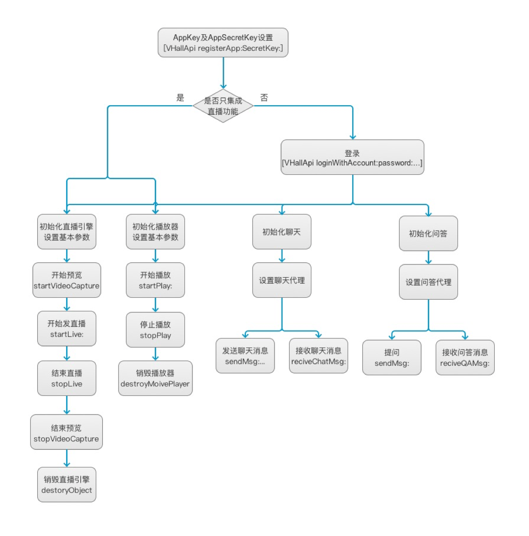 发直播、观看直播、聊天、问答这4个模块的集成流程逻辑如下。